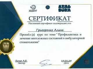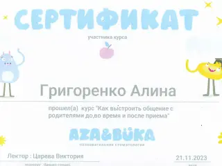 Специализация и профессиональные навыки Детская стоматология в полном объеме, адаптация детей со страхами перед лечением, детей с неудачным опытом посещения стоматолога. Лечение и профилактика кариеса, пульпита, периодонтита. Комфортное лечение в седации (закись азота). Эстетическая реставрация всех групп зубов у детей. Удаление молочных зубов. Проведение профилактических и гигиенических процедур, профессиональная гигиена полости рта при молочном, сменном и постоянном прикусе.