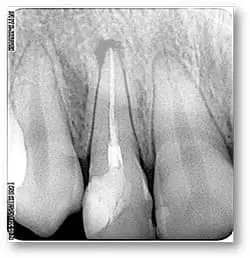 Пациентка Наталья (14 лет) обратилась с жалобами на боли при надкусывании на боковой резец слева (22 зуб). Этот зуб был лечен 2 года назад по поводу осложненного кариеса, под анестезией было проведено удаление нерва, пломбирование канала и постановка композитной пломбы. При осмотре: пломба не соответствует клиническим требованиям, незначительная болезненная реакция на постукивание. Был сделан прицельный снимок 22 зуба.